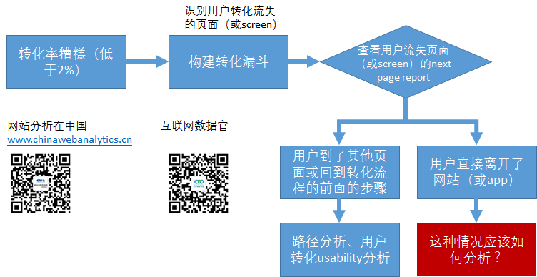 第一类情况,用户没有进入下一步的转化环节,而是跑到了网站的其他页面,或者回到了之前的转化环节。这个情况比较常见,由于我们知道用户跑到了哪里去,所以是有针对性的优化方法的。我的课程上有详细的方法和案例的介绍,这里简单复述一下,分析方法主要是依靠路径分析、用户转化过程中的usability(可用性)分析等方法。