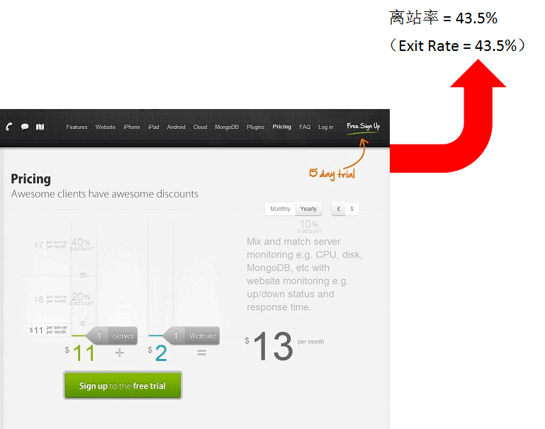 我们猜测,用户不太乐意的原因可能是:1. 这里明明是在谈论pricing,但按钮却是关于free trial,让用户相当零乱。2. 过于灵活的配置方式可能让用户在价格上犹豫不决,反而影响了他们的购买决策——在购物心理学上很清晰的表明,这是每个人都有不同程度的“选择恐惧症”。与Dell这样网站自己配置电脑的有限选择不同,这个产品服务的配置实在是有过多的数量选择,这非常容易造成用户的犹豫。