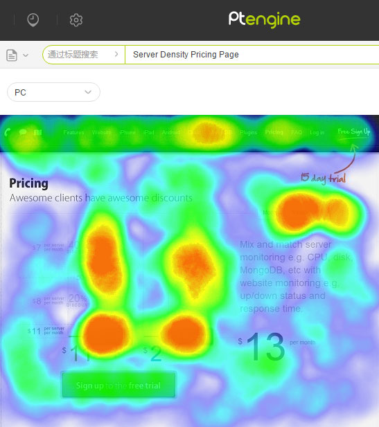 在图中你可以看到,人们确实大量的使用了产品配置的工具,左边的两个可以拖动的滑竿和右边的货币单位切换,有大量的使用,可是,最终点击下面绿色按钮“Sign up to the free trial”的情况,却相当罕见(这个按钮并未显示出红色的点击状态,表明并没有太多人点击这个按钮)。