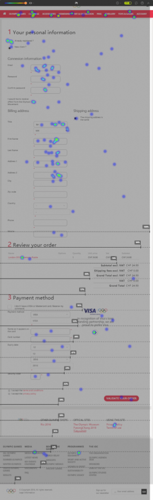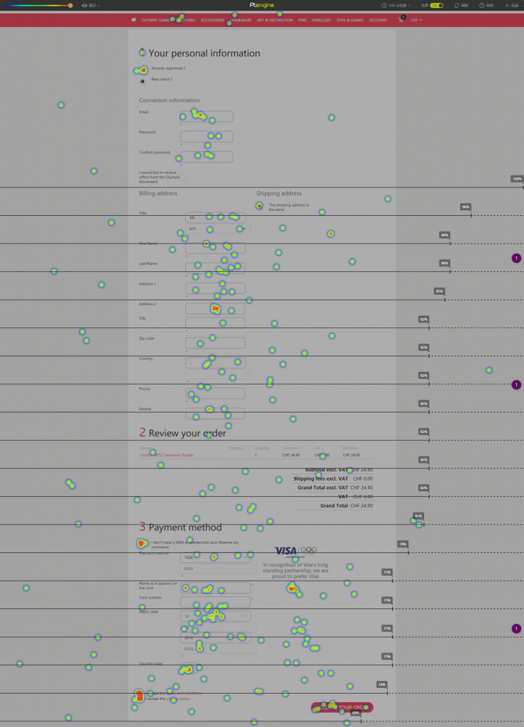 从PC和移动端用户的交互情况对比看,移动端流量相对较少,所以热点也不是很显著。不过,浏览线可以看出二者之间的很大差异,PC端的用户69%的情况下浏览到了页面最下端的红色按钮位置,而移动端这一比例只有39%。这一差异相当强烈的表明,移动端用户的使用体验并不好,网站没有为移动端做自适应,且将所有步骤填充在一个页面中对于移动端太长了!显然,在PC端这不是问题,但在移动端,用户不再适应,最好的解决方法是在移动端重新设计购物过程,把这一页拆成三页,让用户能够更从容的在小屏上进行交互。