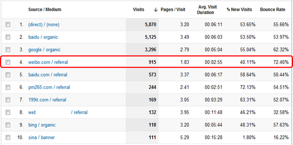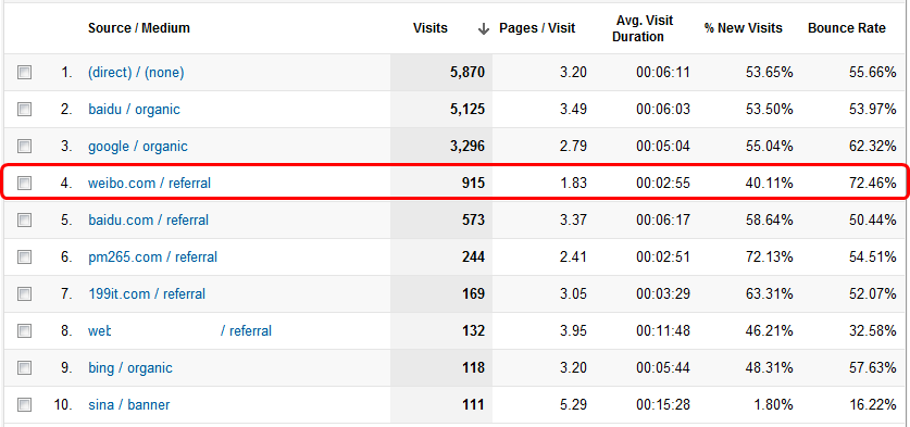 流量靠不靠谱的辨识,要用对比法。通常而言,对于某一个网站,或是对于某一个重要的landing page,如果部分流量渠道bounce rate表现良好而另外一些表现不佳,我们可以认为部分渠道与网站(或landing page)有更好的匹配,而另外一些渠道则匹配不佳。例如下面的例子中,weibo.com的人群似乎不是那么喜欢你的网站。