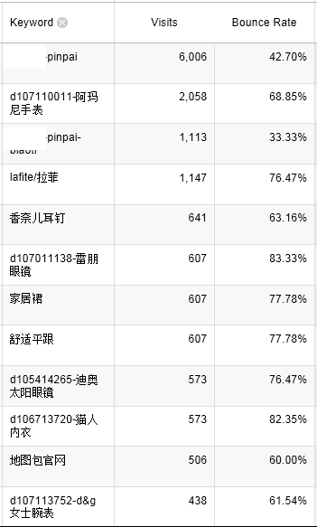 在这个例子中,我们还可以看一下第三大流量来源google/organic,它并非很差,但毕竟比它的朋友baidu/organic的表现差不少。为此,我们有好奇心看看到底哪些关键词带来的流量与网站不匹配。分解搜索引擎流量特别有意义,由于搜索引擎的关键词包含了用户的兴趣信息(显然,只有你对某个事物产生了兴趣,你才会搜索它),因此不同关键词的bounce rate直接反映了网站对于这些兴趣的满足程度。