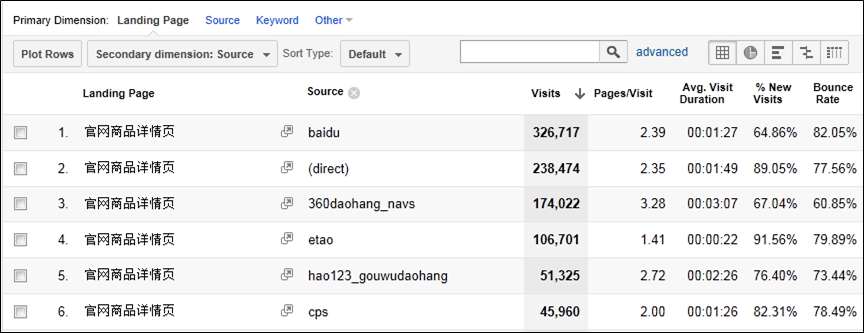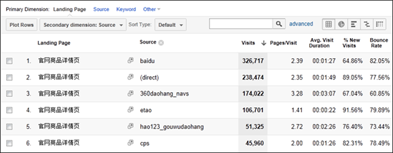 上图这个例子不算特别典型,但可以参考,可以看到这个重要的Landing Page(重要的原因是因为它流量很大)的主要流量来源bounce rate表现均不令人满意。假如这里360daohang_navs的bounce rate也高达70%或以上的话,那我们基本上可以判断这个页面bounce rate高企并非流量之过,而是自身或其他因素造成的。