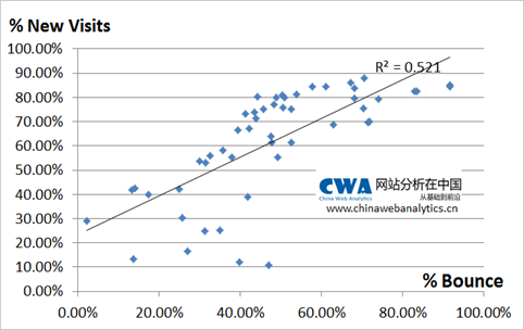 在网站分析中有一个约定俗成的规律,即对于商业网站而言,bounce rate的值往往和% new visitors有线性相关关系,有些甚至二者有近似1:1的关系,颇有趣味。可以认为,为了获取更多的新流量,我们的代价往往是牺牲了更好的bounce rate,这种牺牲完全可以理解。下图是近50个我曾经监测过的大小网站的bounce rate和新访问比例之间的对应关系,具有比较明显的线性相关性。这意味着某种我们不期待却又实际存在的“悖论”——如果我期望bounce rate降低,那么我应该尽力挽救我的老用户,但老用户比例过大,网站流量的形势恐怕又不会那么乐观。