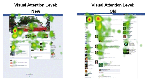 下面这张图是Facebook改版前后的用户注意力热图。一言两语似乎没法表述这次改版到底是成功还是失败,但在某一个方面,Facebook很成功的让用户的注意力产生了“左右对称”,而摆脱了“Google页面的浏览模式”。