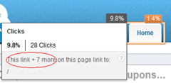 如果你足够细心,你会发现曾经在Google Analytics中有一些热图的点击百分比例的标注是实线格,有一些则是虚线格。虚线格的意思是,存在一个或者多个完全一样URL的链接,标注的这个link只是其中之一,并且标注的百分比并非是这个link的点击量,而是所有具有这个URL的links的总点击量。现在Google Analytics采用了更好的方法,即直接标注出这个URL有多少个相同的链接(如右图所示)。因为多个链接共享同一个URL的原因,解释了为什么有一些朋友认真的把Google Analytics页面点击热图的所有百分比加总起来不会得到100%,而是远高于100%的原因。