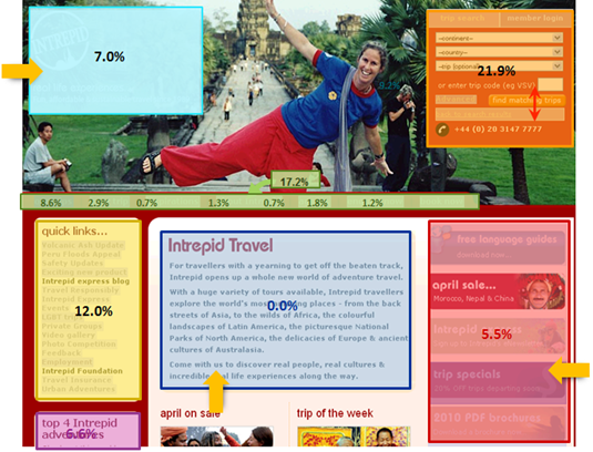 谈了不少注意力热图,该说说点击热图了。关于点击热图,事实上在专门的网站分析工具出现也已经出现了,而并非是Google Analytics或Omniture的专利。依据每个点击带来的效果的不同,点击图其实又可以分为鼠标点击的热图,描述每个链接发生转化数量的热图以及描述每个链接最终产生的销售的热图。我们最为常用的是鼠标点击的热图。