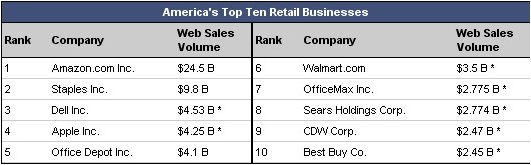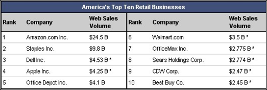 对于第二种,传统品牌商相对于目前这波从互联网起家的电商而言,具有太多优势。电子商务的本质是商务而非电子,对于商务这个基本面的各个方面,传统业者的品牌本身的知名度和可信度相当程度降低了市场和营销成本;供货本身具有更大优势;供应链的其他领域也可能存在优势;并且线下商业积累的管理经验与年轻浮躁的互联网电商相比绝不可同日而语。很显然,美国已经为我们做出了表率,看看下表中销售最猛烈的电商中有多少家是传统线下的品牌(数据源自2010年的统计)。