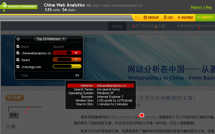 这篇文章已经太久了,现在这工具有了一些新的小变化,比如无收费版,可实现按时间筛选热图区等。这个工具更多地非常适用于网站的用户体验的研究和提升方面,比较宜于监测网站访客的特征和习惯,从而在数据的基础上提升用户体验。期待CWA上对此类工具的扩展和更新噢。