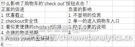 影响购物车check out的因素有哪些?我们列出一张表,包含两列。一列是正面的促进作用的,一列是负面的影响的。