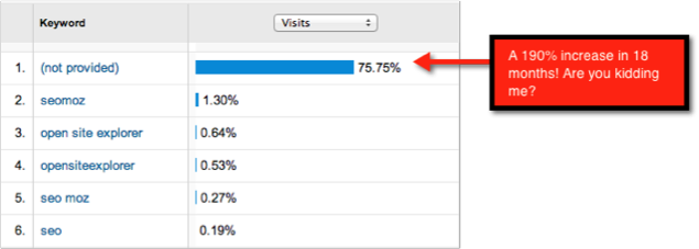 然后Google安全搜索出现,流量源数据变得更加不透明了。除了不知道流量来源于通用引擎的哪个具体垂直领域,还有约10%的情况下,我们甚至连流量来源于哪个关键词都不知道。一直困扰我们大家的问题是:如果我们完全不知道为什么客户得到了上述所谓的搜索流量,我们还怎么帮助客户的内容策略呢?不幸的是,安全搜索的范围现在已经极大扩展并占据了google流量的巨大比例。比如这里有SEOmoz最新的未知关键词占比。天啊,超过75%了……