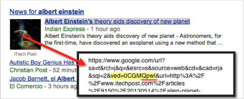 • 谷歌新闻的图像优化:Google News OneBox的顶部链接通常是一个不同的源而不是图像缩略图。如果ved = xxxxQqQIw ÷ ved = xxxxQpwI(或者叫链接与图像的比例)失衡,则说明图像需要优化。新闻发布者需可以用这个数据来衡量比对优化结果和预先建立的最低预期。