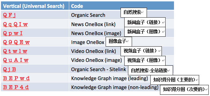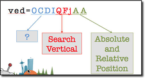 在这里我要强调两个参数:‘cd’ 和 ‘ved’。 ‘cd’参数我以前的文章中已经提及,它告诉了我们搜索结果在搜索结果集合中的位置。而‘ved’参数则据我所知,被分成了三部分,分别告诉我们搜索结果属于哪个Universal Search垂直类别(图中的Search Vertical),在这个垂直类别中的位置(相对位置,图中的Relative Position)和在整体的搜索结果中的位置(绝对位置,图中的Absolute)。接下来我将聚焦在这个帖子关于Universal Search垂直类别的部分,并在之后详述相对位置和绝对位置的情况。