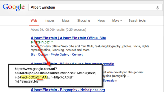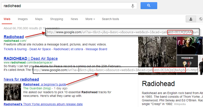 简单来说,Google流量源字符串就是在一组搜索结果中分配给每个URL的“href”的值。当用户点击上述搜索结果,在到达最终结果页面之前会被重新定向到一个google的URL,在这个例子中是Radiohead.com。Google这么做非常可能是为了集成它的内部数据,也许集成的就是与搜索引擎结果页相关的数据。我们应该并不能从这些数据中了解我们的流量来自哪里,但Google却必须利用这些数据。