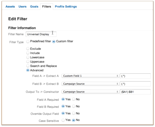 接下来,需要建立两个高级过滤器,一个用来从谷歌流量源字符串中提取‘ved’和‘cd’参数,另一个用来显示谷歌分析的数据。如下图: