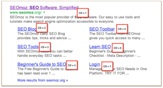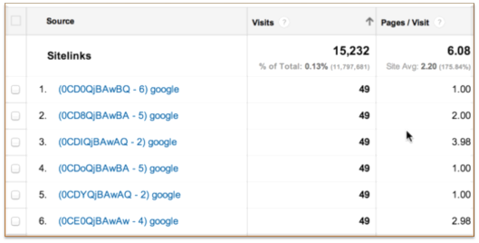 另一个有用的值得去琢磨的‘ved’是Sitelinks里面的ved。(译者注:所谓的Sitelinks是指搜索结果的主条目下面还有这个网站一些内容或频道的链接。)Sitelinks是一个品牌搜索产生的结果的集合。谷歌在算法上决定应该包含哪些链接,但网站管理员有权限在网站管理工具中给链接降级。因此,‘ved’参数可以在衡量被Google记录为Sitelinks的那些页面的表现,以及我们可以做针对性的哪些行动(例如给一些没有点击流量的Sitelink页面降级)。为了搞清楚哪一条Sitelink送来的流量,需要看下流量源字符串传过来的cd参数。我们把这个功能加在了过滤器中,你的数据会如下所示: