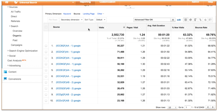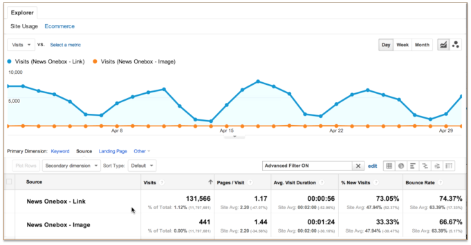 在一步一步举例说明如何使用google的流量来源字符串(referral string)来解释你在Universal Search中的流量是从哪里来的之前,我想提出一个我们在AudienceWise就遇到的问题。2011年,马修.布朗和我建立了一个广告公司帮助新闻类网站的技术性SEO和受众开发。我们另一些工作,尤其是马修在纽约时报的工作,主要是努力解决Universal Search流量来源数据缺失的问题。直到我们的网络分析平台被关注之前,来自于网页搜索的访问(visit),News OneBox的链接,以及图像结果都被相同对待了,它们被毫无差别的称为:自然搜索流量(organic search traffic)。