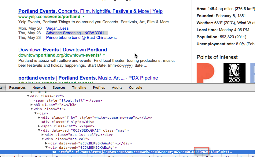 • 分析语义标记的效果:由于SERP中开始包含更多的可点击的rich-snippets和知识图表元素,很明显已经可以解析和理解使用ved参数的字符串。我已经开始只看带有rich-snippets的结果,但内部数据表明ved参数甚至可以看出我们点击的事件和片段是哪种类型的。下面是几个例子:(这是一个可以让我们的社区做更多深挖的地方)
