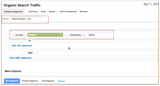 用你正在分析的Universal Search的垂直类别来命名你的高级细分比较合适。在这个例子中,我称之为Google News OneBox中的一个标准‘蓝链’结果。从那里,你要做的就是寻找所有包含你要分析分离的‘ved’的源。在这个例子中,我们正在找‘QqQIw’。