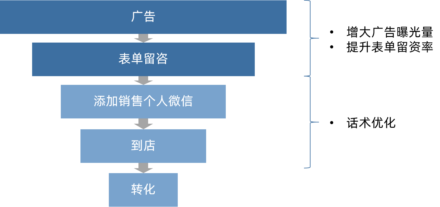 在全部的转化链路中,获取线索只是局部。如果只关注广告的曝光、点击和表单的填写的优化,效果肯定存在明显的上限。