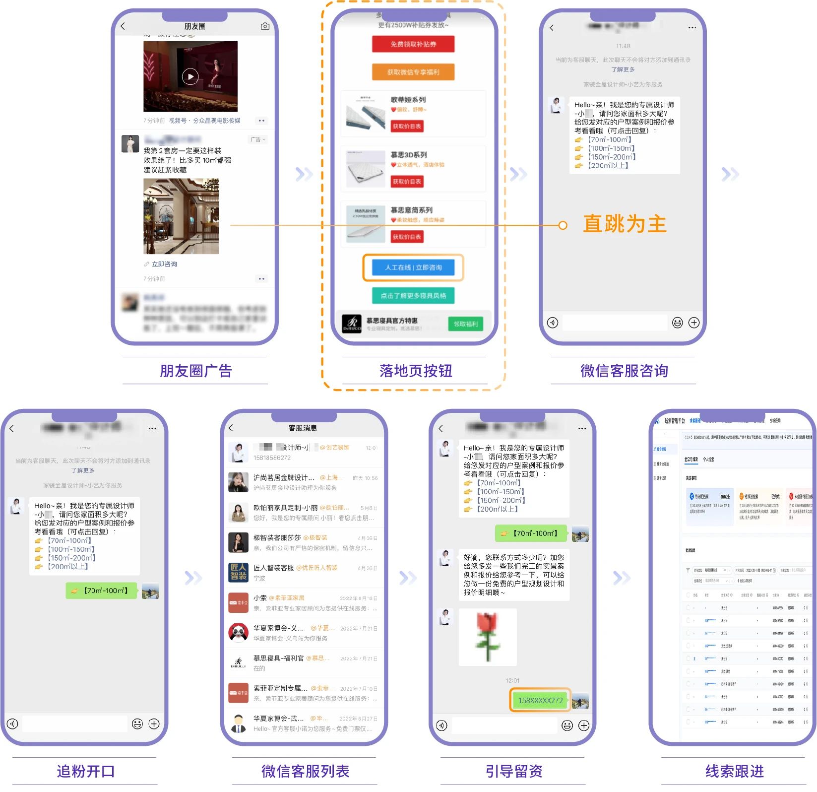 以获取线索留资为营销目标的家居行业的例子很典型:点击广告后通过“临时会话+电销”的形式已成为主流。用户点击外层广告素材或落地页按钮,直接与微信客服快速确认初步意向,再引导客户留下号码详细咨询,留资成本下降明显。