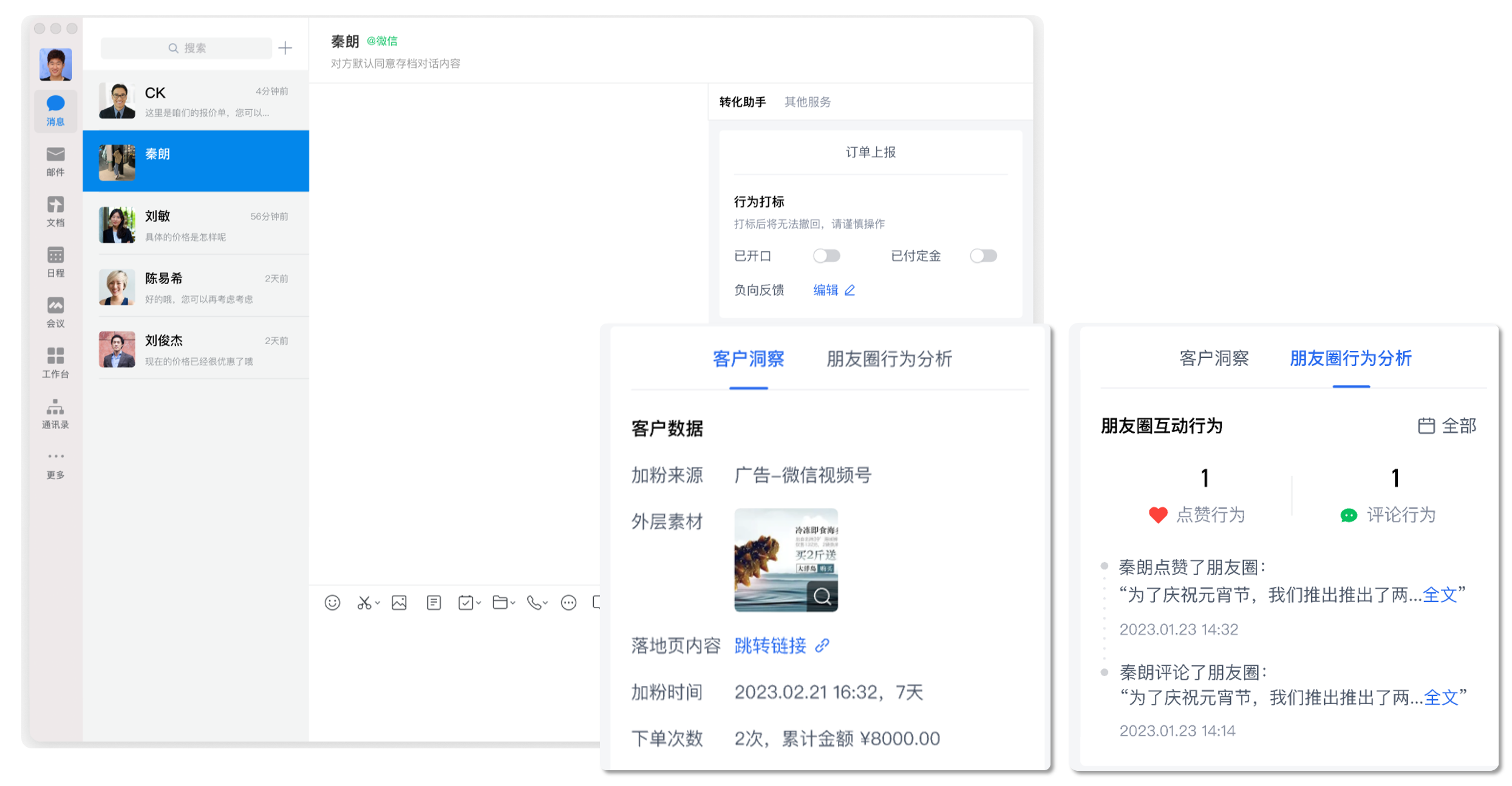 比如某个用户是看了我一个9元小白理财课来的,那我对他的基本倾向与需求都会有个初步的了解。用户后续的下单付费情况和朋友圈点赞评论,也会同步更新,保证下一次跟进时对用户的最新需求有更明确的认知。提升客服的沟通效率的同时,也提升用户的沟通体验。