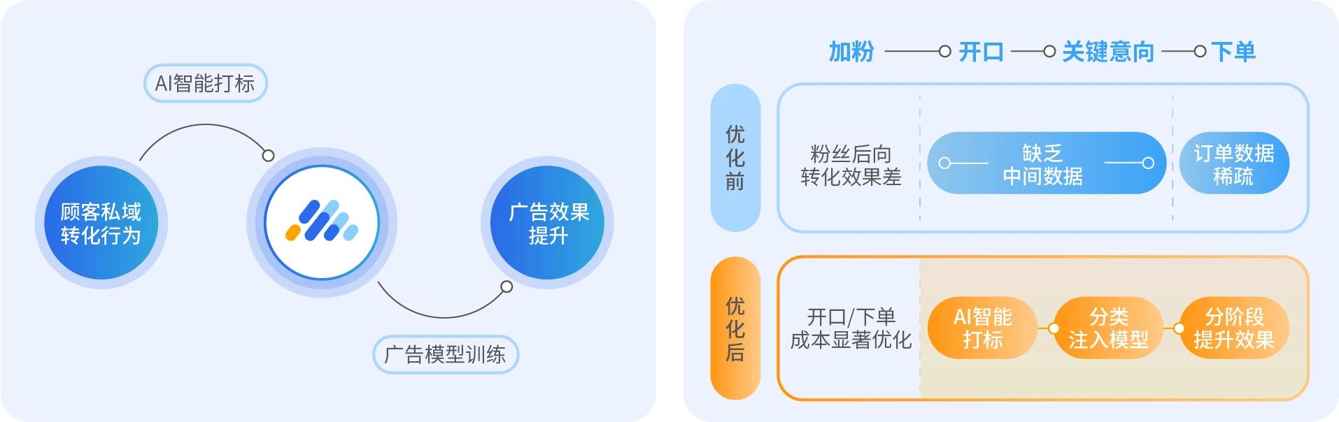 智能打标功能将会话非标准的数据形式,以标签的形式实现数据标准化。借助腾讯广告转化宝的AI能力,补足了长期以来缺失的中间数据。