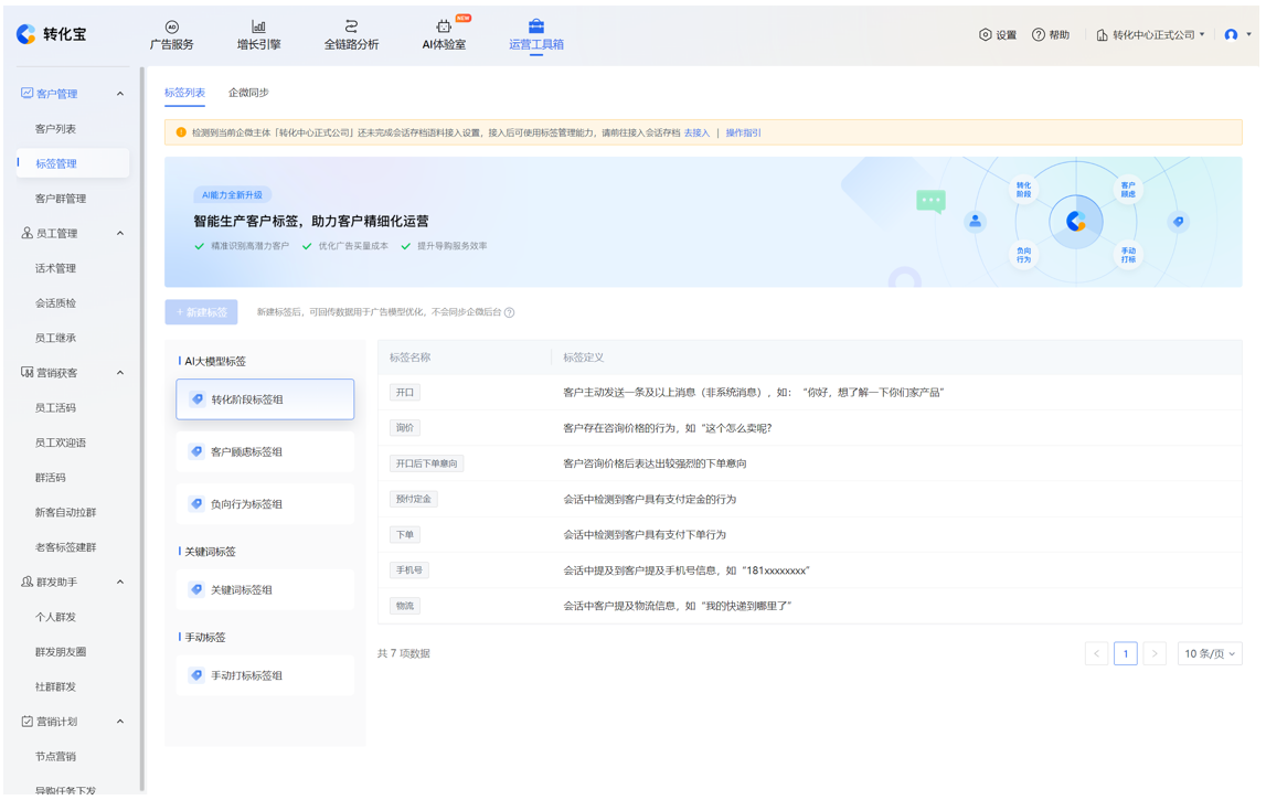 一个更主要的场景是自动打标反哺公域投放。转化宝的AI智能打标功能能从会话语料中提取用户关键标签有效开口、产品咨询,询价、下定等行为数据作为广告优化的辅助数据。