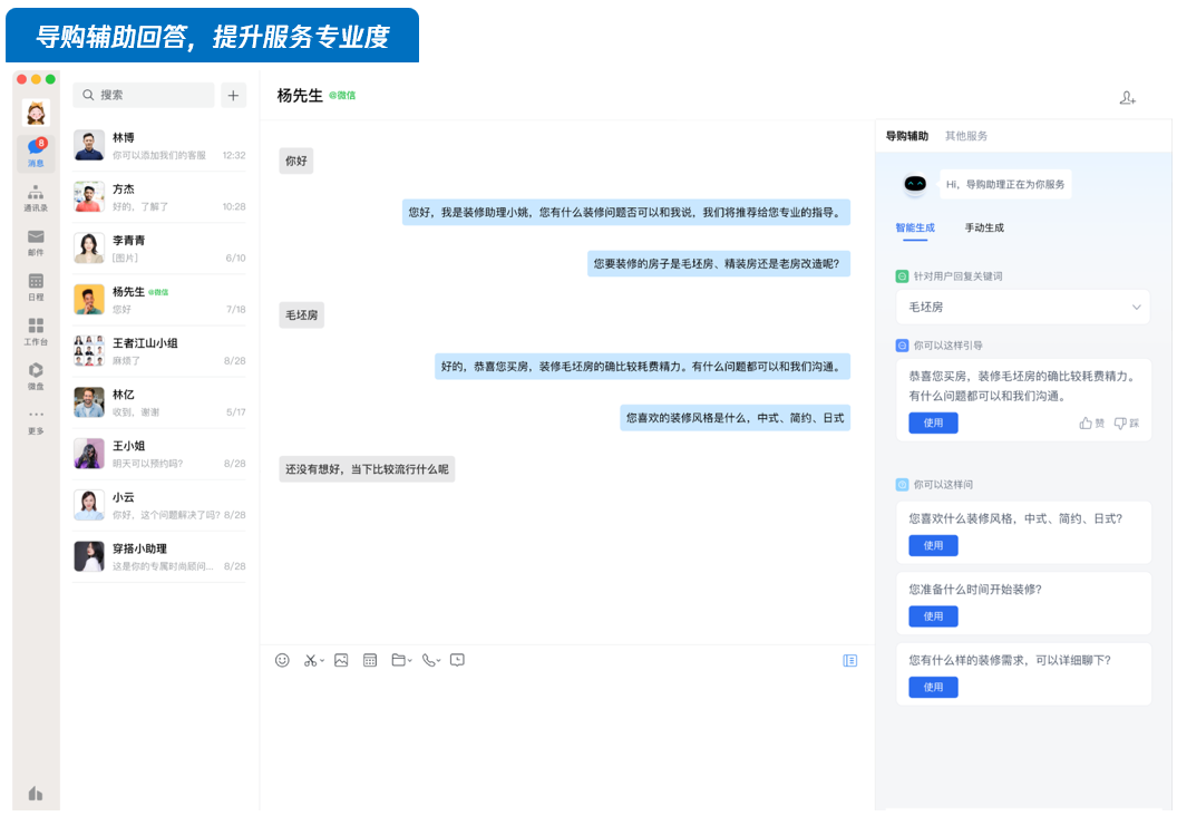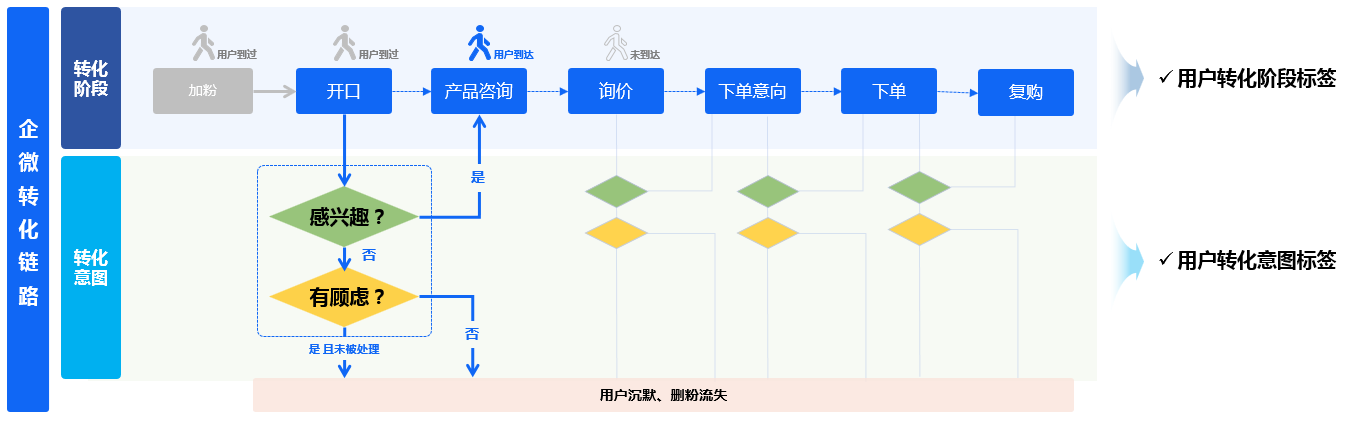 企微微信是有打标签的功能,但用过的同学应该知道要想一线的客服人员能完全的理解你制定的标签体系,并能完整的执行下来是有多难。毕竟要让他们在每一次与客户会话后及时更新标签,这种要求是很反人性的,因为生成的标签更多是应用在后端运营中并非体现在即时动作中。