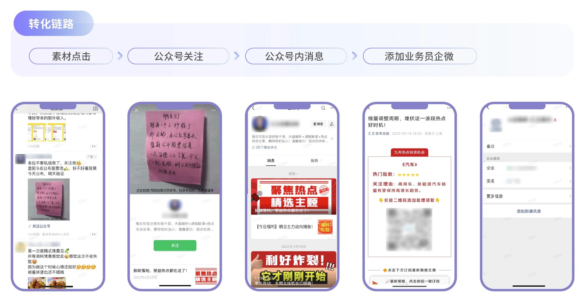 而对于专业度更高的行业如金融,选择公众号+企微的方式能触达更多潜客。在广告投放平台,以公众号加粉为主要目标。先通过公众号吸引有初步意向的用户利用推文树立强专业的形象,再引导添加企微二次筛选出高意向目标客群。同时,公众号能持续能持续影响用户。