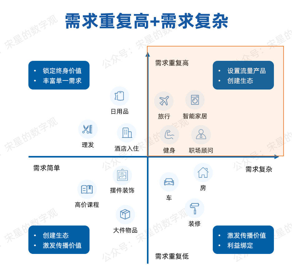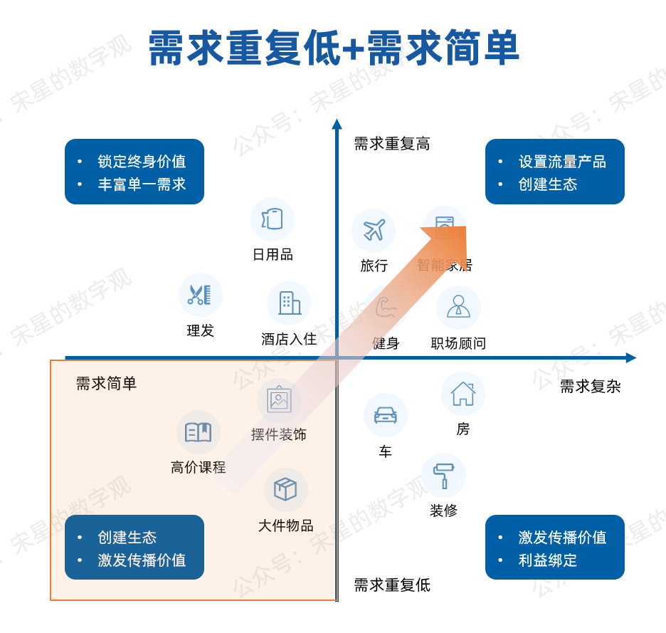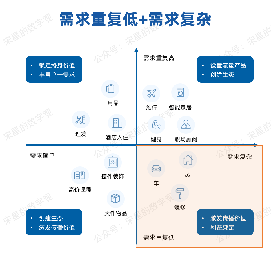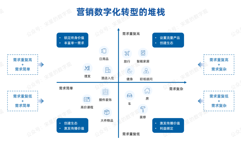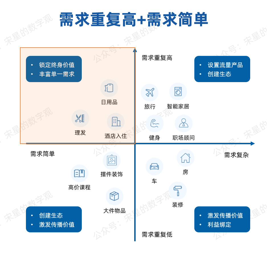 在聊提升用户复购和生命周期价值之前,我们先从用户角度来看下用户的需求都有哪些类型。这个很重要,有助于帮我们理解用户复购的基本逻辑。我们按照需求的复杂度和重复度两个维度将用户需求划分为四个象限,如下图: