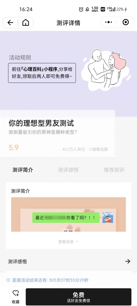 传播价值案例1:心理测试活动,通过赠送好友获得免费测试机会