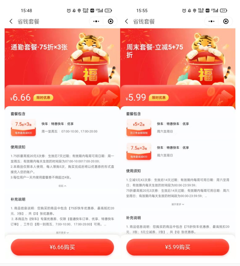 2)运营玩法:针对多场景设置不同优惠券套餐2.1.通勤套餐:针对周一到周五通勤打车场景,套餐设置了3张7.5折优惠券。一般来说通勤场景下,用户一天内可能会有2次打车,因此3张优惠券的套餐,不会让用户担心无法用完优惠券,更可能购买。而当用户购买优惠券后,5天内3次使用滴滴打车的可能性更大。2.2.周末套餐:针对周末出行游玩场景,套餐设置2张5元优惠券+3张7.5折优惠券。周末出行游玩场景下,用户短期打车需求更频繁,对此设置含5张优惠券的5.99元套餐,并且其中还包含无门槛立减5元的两张优惠券,体现出套餐的性价比,用户更可能购买。同样当用户购买后,周末的打车需求均被滴滴锁定,而不会使用其他平台。