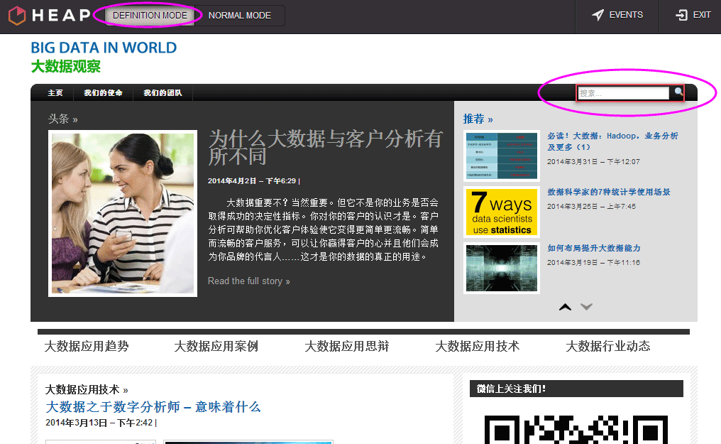 HeapAnalytics的方法是,它提供了一个所见即所得的追踪方式——HeapAnalytics在它的监测配置页面中,直接引用了你的页面,然后,你的鼠标移动到页面的任何可交互位置,都会有一个红框把该交互元素框取下来。这时,如果你点击,就等于告诉了HeapAnalytics说,“我想监测这里”,于是HeapAnalytics让你把这个想监测的地方起一个名字,然后它就会开始帮你监测这个地方。是不是追踪设置非常简单?下图中所示的,就是当我把鼠标停留在搜索框的位置时,HeapAnalytics的监测确认红框也框下了这个互动元素。一旦我确定这个地方需要监测,并且提交给HeapAnalytics,它就会忠实记录这个搜索框被激活的次数加上搜索发生的次数。如果你想单独记录搜索框被激活的次数,或者点击放大镜图标的次数,只需要把鼠标移动到相应位置即可。