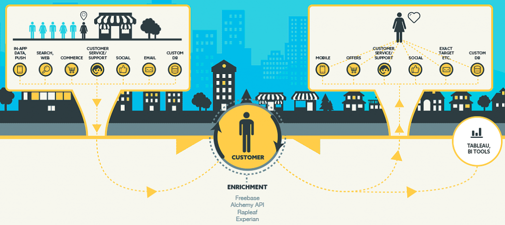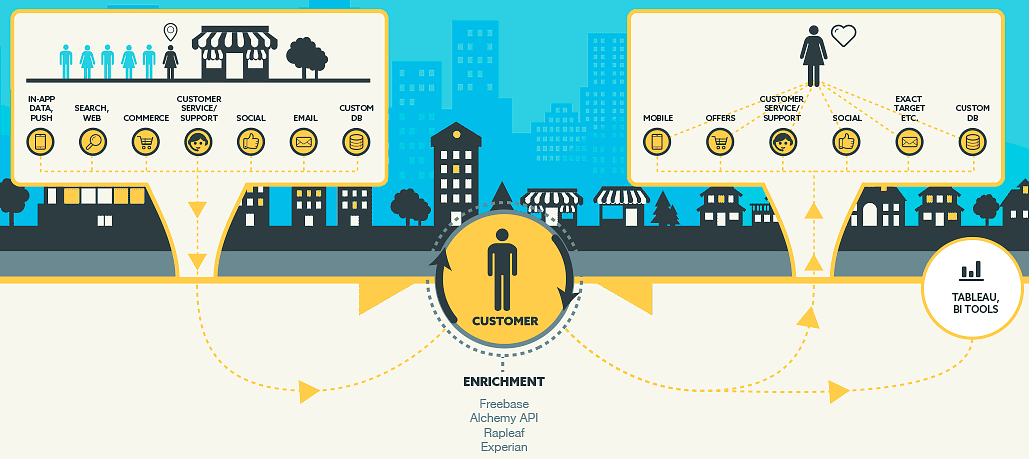 1. 收集理论上与每个顾客相关的数据:Mobile上的用户行为数据、互联网上的浏览数据、在线购物数据、客服支持或CRM数据、社交媒体上的数据等等等等。