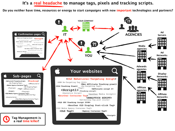 问题是,我们要应付的还不只是一个GA的代码,还有很多其他监测的代码,比如我们在第一集提到的那些工具,比如Miapex的代码,或者流行的Adobe Analytics工具神马的。而且,我们还不只是会在页面上放置监测代码,我们还会放上很多营销工具的代码,例如做targeting,retarting,还有RTB的代码——页面上塞满了各种代码,我们每次要做修改,都要让技术同事忙活一番,而且还存在着各种可能没能事先预知的危险。所以,这绝对不是可以轻视的事情。
