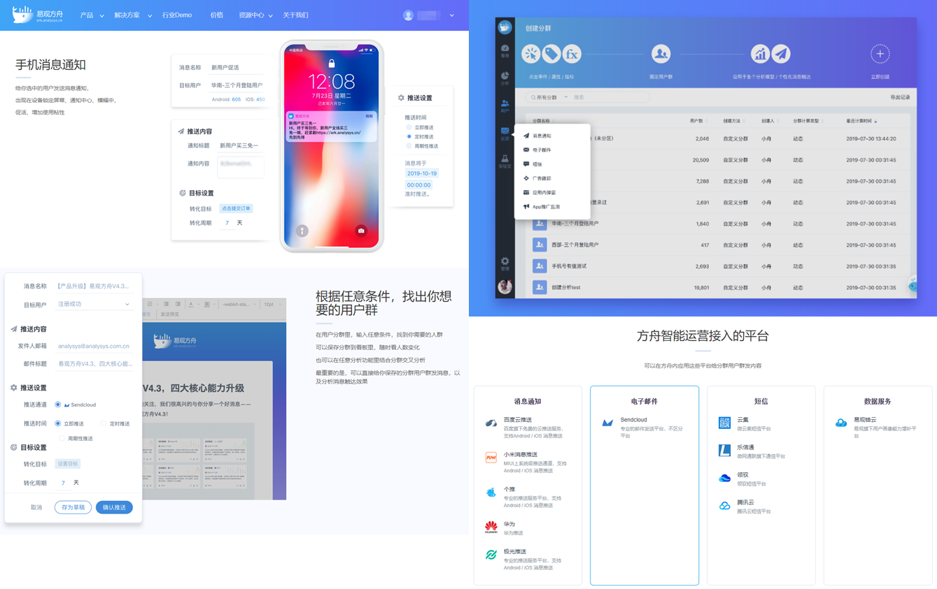 这个工具支持在人群细分的基础上,对不同人群进行营销触达的推送,支持弹窗、app消息通知、短信、邮件、广告再营销等等平台。本质上就是一个功能非常全面的MA工具。