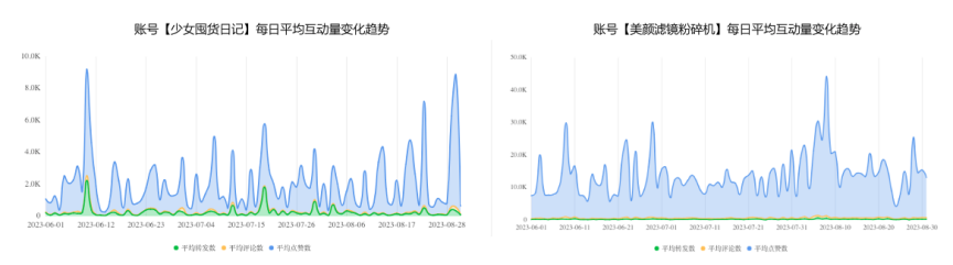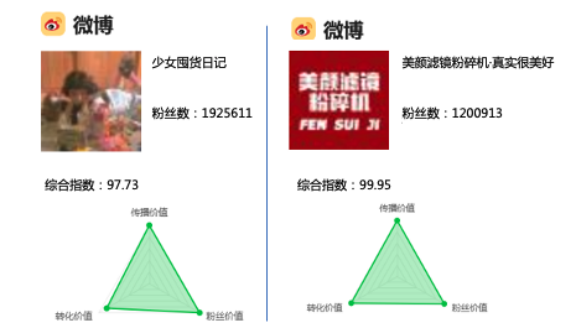 比如上图中这两个账号,结合粉丝数、综合指数以及互动趋势来看,不仅可以了解达人们的真实水平,而且对爆点内容和达人一定程度上可以提前预测。