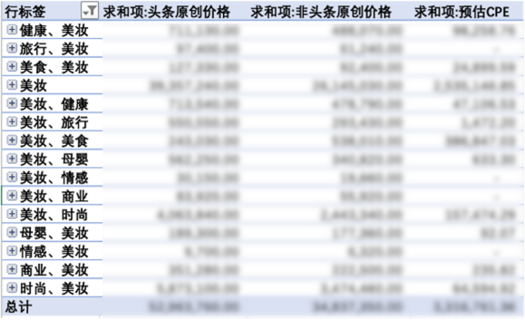 在工具中,选中想要分析的具体字段,通过数据透视就可以发现各个类型的达人价格以及预估CPE的高低。通过不同维度和字段数据的对比、总结分析,广告主们可以分析各个细分垂直赛道的成本对比,找到性价比最优的投放达人类型。