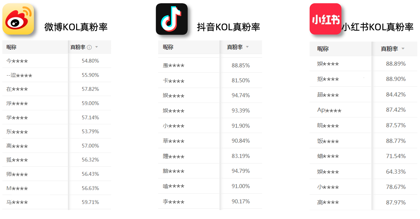 比如,微博是以传播信息的表达场景为主的,这个特征下达人的真粉率普遍会比抖音和小红书以互动转化场景为主的平台数据低很多,我们在工具上选取了同一达人类型进行分析,可以看出微博粉丝的的真粉率普遍在50%-60%,抖音和小红书基本在80%-90%左右,远高于微博水平。