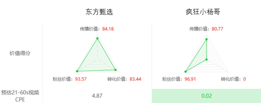通过分析可以看到,【疯狂小杨哥】和【东方甄选】的21-60s的视频预估CPE分别为0.02和4.87,帮助广告主们在打曝光期间选择传播价值相对较高的达人。