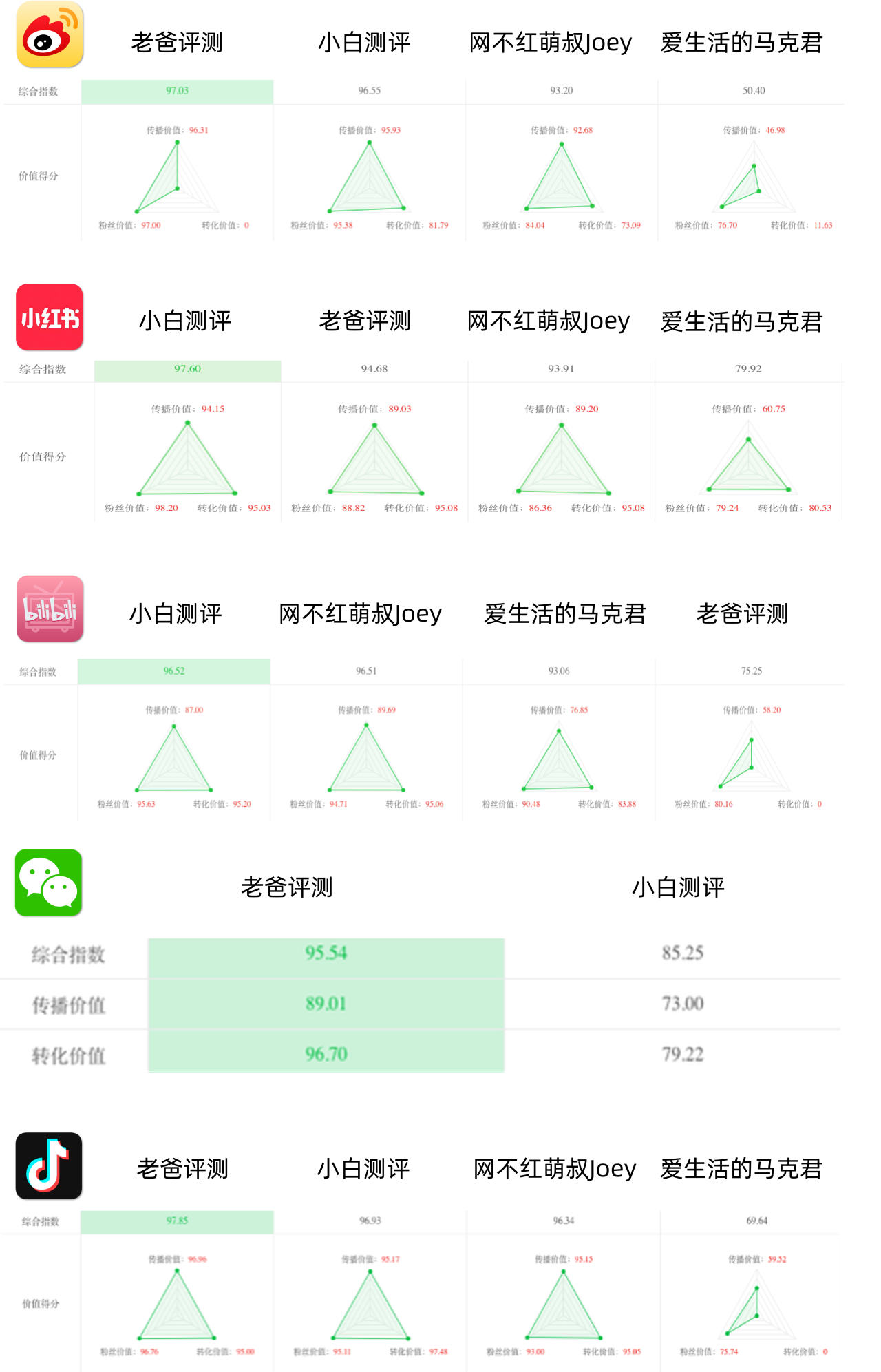 首先,要选定候选达人。可以发现,在不同平台的传播价值、粉丝价值以及转化价值都是不同的,且平台之间的差异并不小。对于品牌主来说,如何合理选择适合自己的KOL是最大的难题。