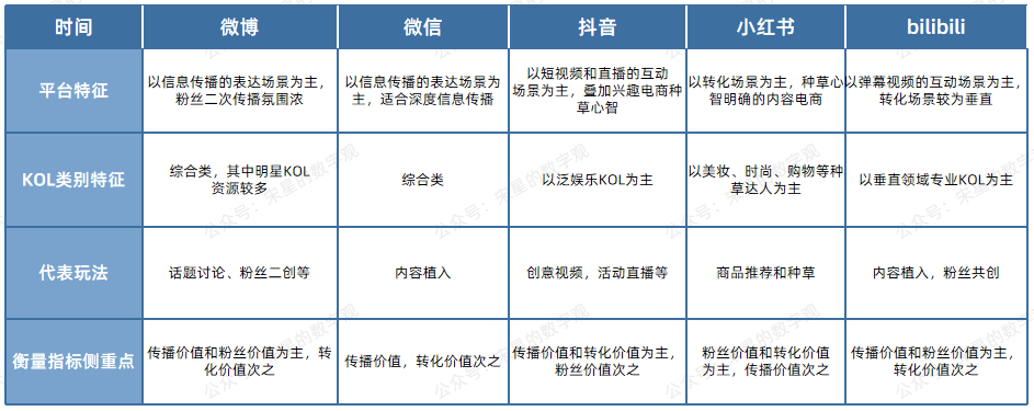 其次,根据不同平台的KOL类别特征以及玩法总结,可以看到在各个平台的特征以及代表玩法不同,适用的衡量指标侧重点也会有所差异。