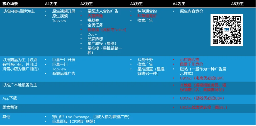 那么,我们还可以进一步按照投放竞价方式、流量池资源(例如,抖音的三类流量池中的哪一个)、是否保量、是否属于智能投放、广告位资源等,进一步细分这些广告投放产品。
