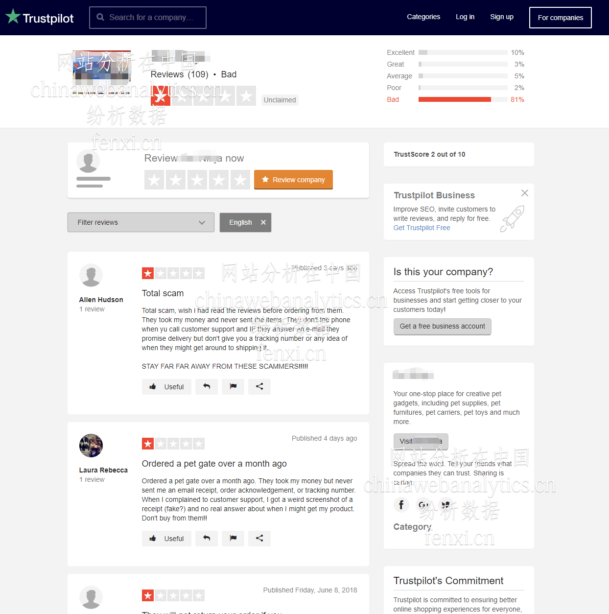 例如,下面这个网站的消费者评价,基本上是灾难。这样的独立站,即使网站本身的体验非常不错,最终的转化率也会受制于消费者的真实体验。