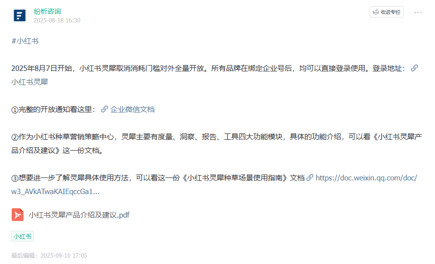 今年小红书种草大会上,宣布灵犀平台全量开放。意味着,只要品牌主有开通认证企业号,同时企业号已关联品牌,就可以直接登录使用灵犀。之前只有年广告消耗超30万的头部品牌才能使用的灵犀,现在中小商家也可以零门槛使用。