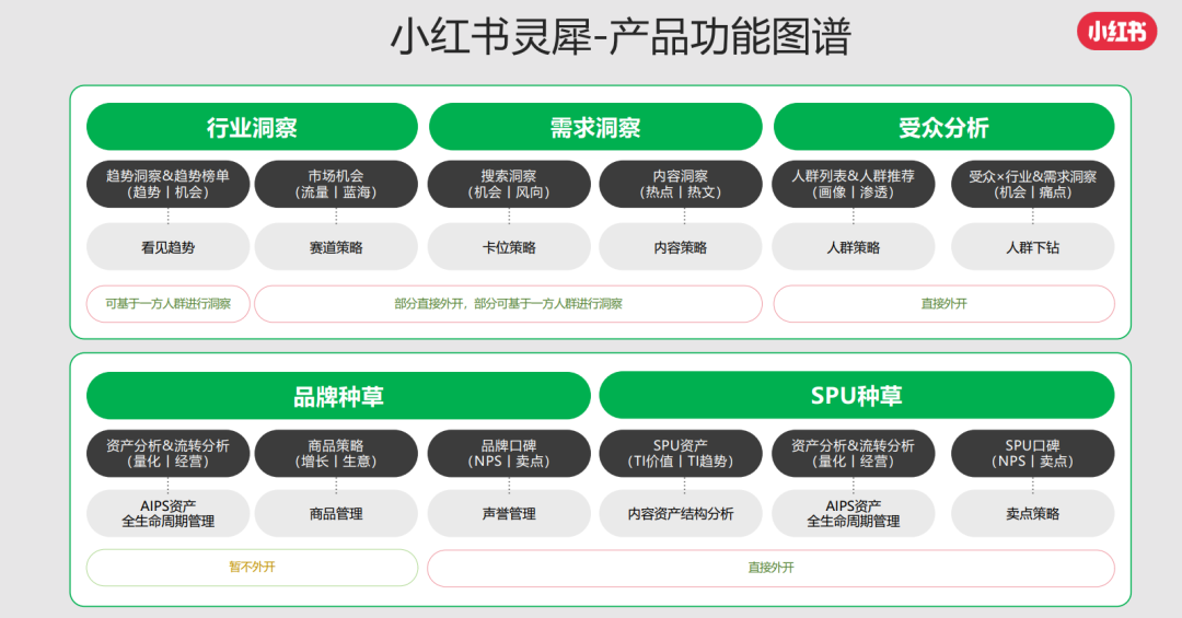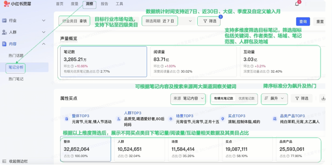 灵犀是小红书在2022年推出的数据营销和种草度量种草平台,类似抖音的巨量云图和淘宝的生意参谋。具体功能如下: