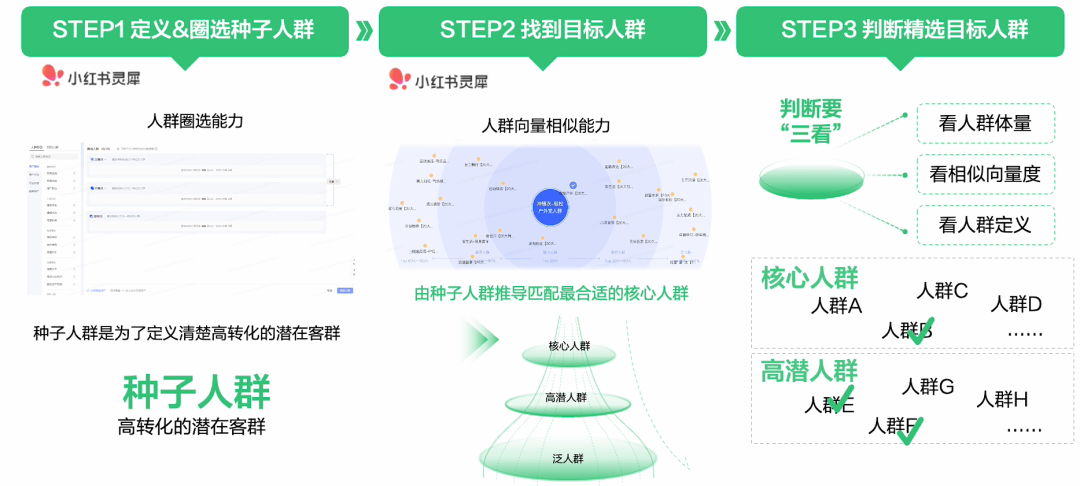 小红书上是反漏斗营销模式,第一步的关键是找到核心人群,最有可能为你的产品买单的人。目前,主要的策略是先找出种子人群,利用灵犀的向量相似功能找到目标人群,再根据人群体量、相似度和人群定位,选择最终的核心人群。