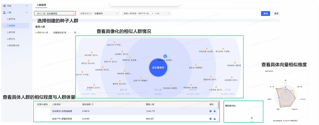 找到种子人群后,使用灵犀的向量相似功能锁定相似的目标人群。如某品牌的种子人群是健身控,与它最相似的人群是运动和户外人群。