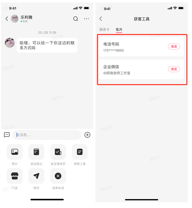 私信中,除了企微名片外也可以选择直接发送客服的电话号码直接联系客户。那直接发送企微的二维码可以吗?如果你的量不大,在私信中直接发送企微二维码不会被屏蔽,但和官方确认还是存在风险,建议还是走下面名片的格式。